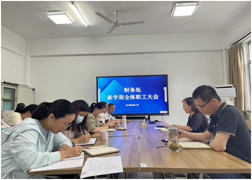 9月11日下午,财务处在文渊楼102室召开新学期全体职工大会,处长刘丽主持会议并讲话。