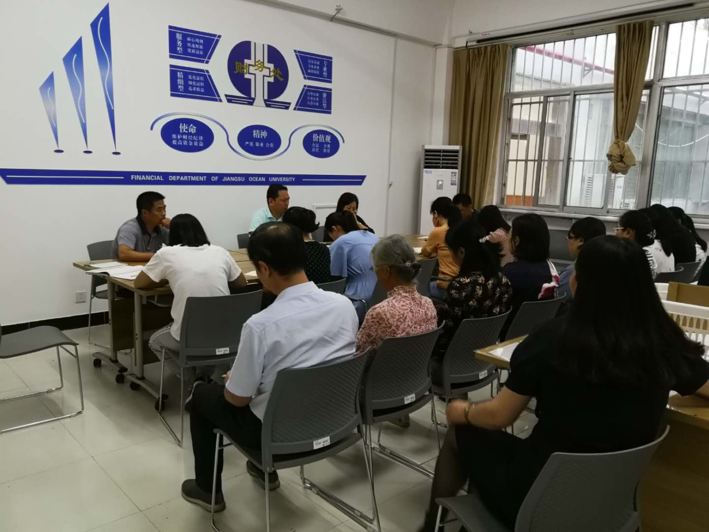 9月6日下午,财务处在文渊楼102室报销服务厅召开新学期全体职工大会。会议由处长毛宝海主持,部门全体职工参加会议。