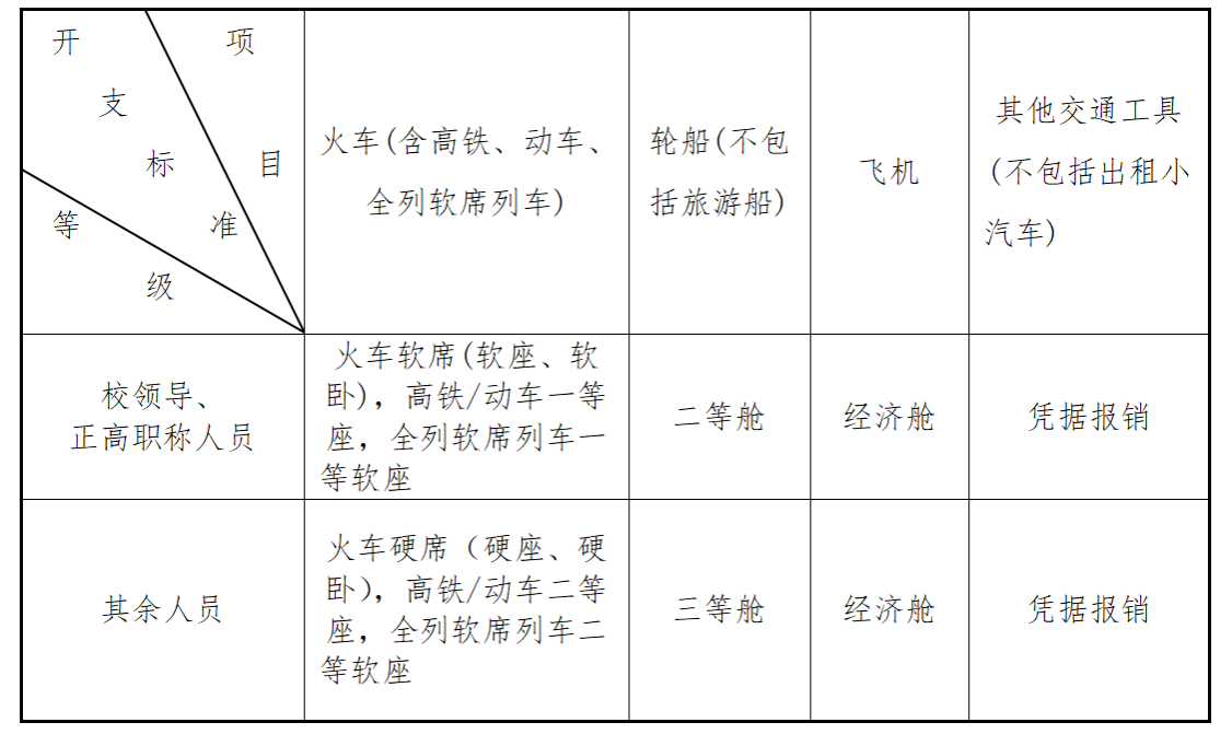 注:校级领导出差,因工作需要,随行一人可乘坐同等级交通工具。