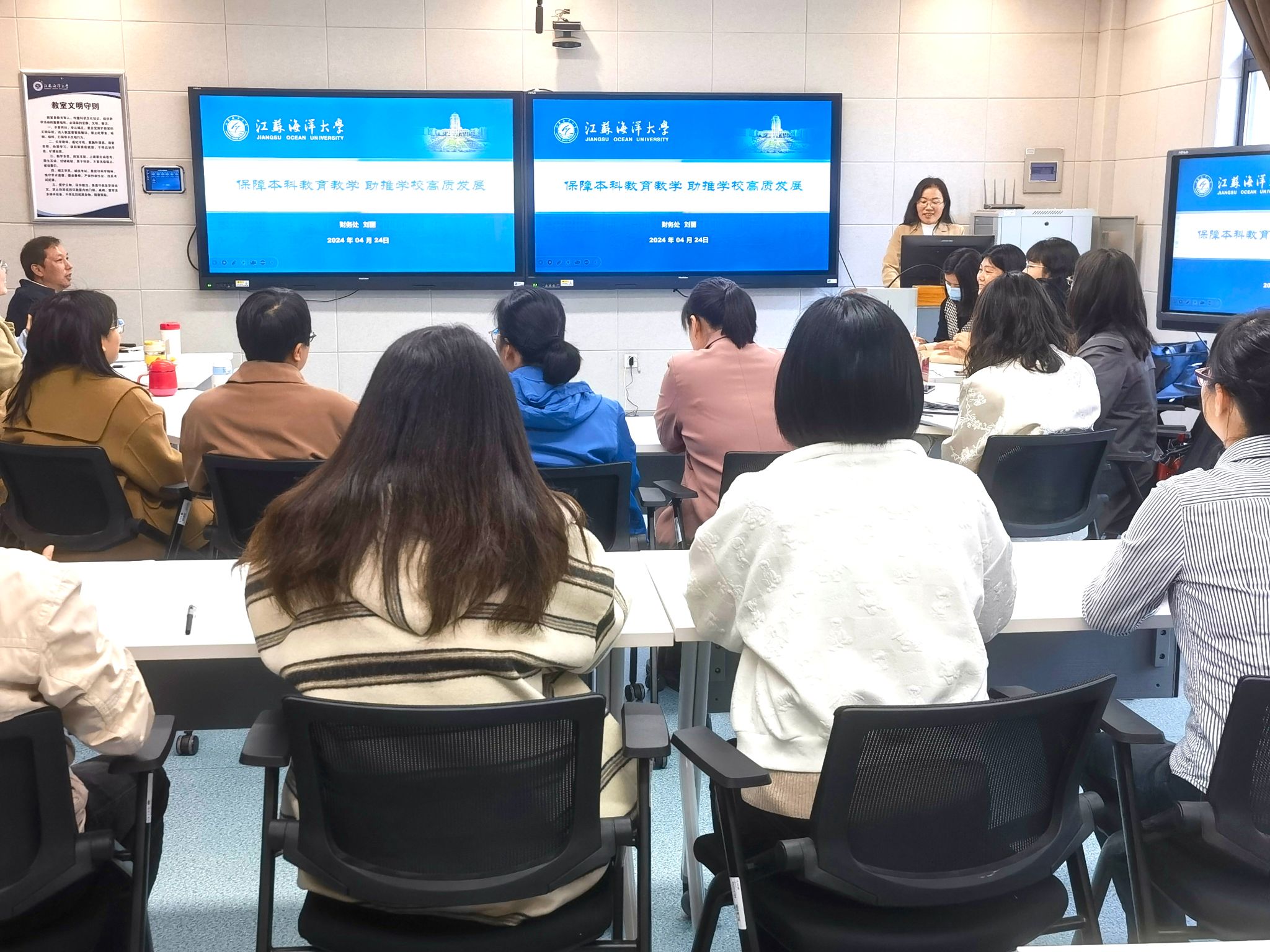 首先,刘丽以《保障本科教育教学 助推学校高质发展》为题讲授专题党课。党课内容紧扣审核评估要求及财务处在人才培养中的地位和作用,全面介绍了财务处在支持和优先保障本科教育教学方面所采取的政策措施、工作亮点及经费投入情况。总结了财务处以党建引领为抓手、以服务师生为核心,严密部署,积极落实学校迎评任务的工作成效,指出了财务工作中存在的不足之处,提出了下一步工作计划。她强调,“以评促建、以评促改,是对全校的一次体检,也是对财务工作的一次体检”,财务工作要以习近平新时代中国特色社会主义思想为指导,认真落实校第一次党代会任务和精神,聚力“三建一高”,以审核评估为契机,推动财务工作高质发展,进一步赋能本科教育教学高质量发展,奋力谱写国内知名、特色显著的高水平应用研究型海洋大学新篇章。