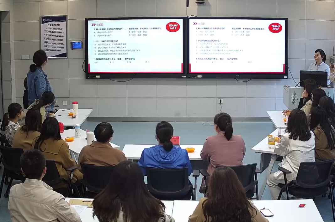 随后,开展了“本科教育教学审核评估应知应会”知识竞赛。本次竞赛共有5支队伍15人参加比赛,着重考察对我校本科教育教学审核评估、校风校训、校史校情等知识的了解程度,展示支部成员学习取得的新成效。竞赛分为必答题和抢答题两个环节,采用小组积分形式,最终累计得分由高至低进行排名。答题环节,每位参赛选手认真审题,力争万无一失,特别在抢答题环节,选手们思维敏捷、争分夺秒,充分展现团结协作精神。参赛队秉持“以学促赛,以赛督学,学赛并进”的宗旨,展示了良好的竞赛水平和饱满的精神状态。比赛现场气氛热烈、掌声不断。