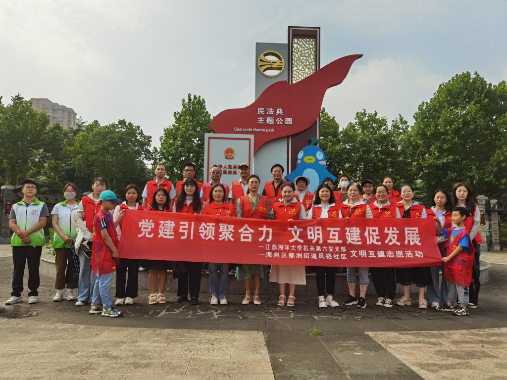 作为系列主题活动的内容之一,为进一步树牢“以人民为中心”的理念,机关第六党支部还联合海州区郁洲街道凤梧社区党支部开展文明互建志愿活动。双方齐聚一堂,分享志愿服务经验,增进了支部间交流,并实地参观了凤梧社区的各个展区,感受到社区近年来取得的发展成果。随后,双方共同开展了绿化维护志愿活动,在各个绿化带区域及马路边捡拾烟头、包装袋等垃圾,为打造美丽社区、提升社区居民的满意度、幸福感贡献了一份力。
